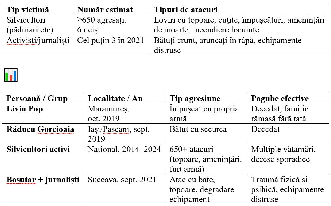 • Federația Silva și numeroase surse documentează că între 2014 și 2024, peste 650 de silvicultori, pădurari și ingineri silvici au fost atacați cu violență, unii cu topoare, cuțite, amenințări grave, iar șase dintre ei au fost ucișiVICE+1Digi24+1.